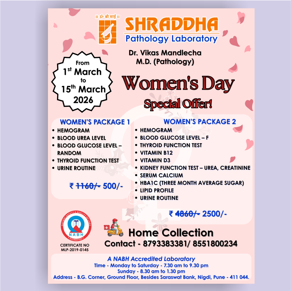Shraddha Pathology Laboratory brings you a Special Women’s Health Check-up Offer from 1st March to 15th March 2026 — designed to care for your strength, balance, and well-being at every stage of life.